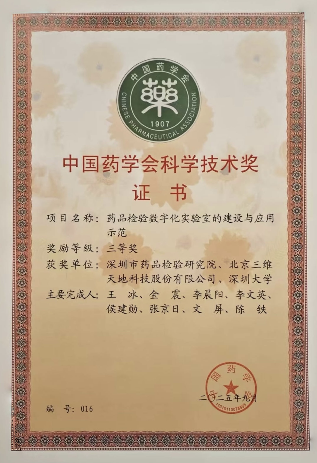 在近日成都盛大召開的2025年中國藥學大會上,一項標志著我國藥品檢驗數字化轉型里程碑的成果受到矚目。由深圳市藥品檢驗研究院牽頭,聯合北京三維天地科技股份有限公司共同完成的“藥品檢驗數字化實驗室的建設與應用示范”項目,憑借其顯著的技術創新性與行業示范價值,榮膺第二十屆中國藥學會科學技術獎三等獎。