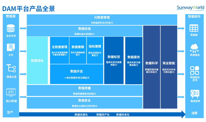該平臺(Sunway-DAM V13)是三維天地借助大數據、機器學習、自然語言處理、知識圖譜等新興技術,在原有產品基礎上進行的全體系的智能化升級,構建的全棧、一體、智能的企業級平臺,形成了一大平臺、三大產品、十三大模塊的完整產品矩陣。